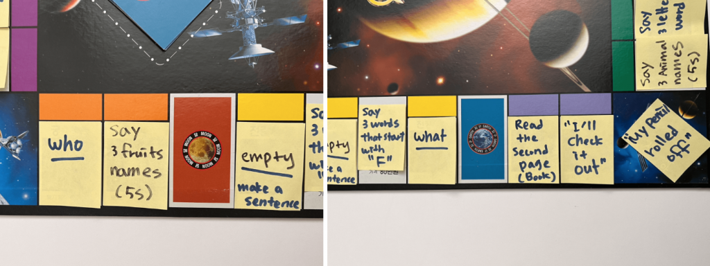 포스트잇을 보드판의 각 칸에 붙이고 아이들이 배운 영어표현, 각종 영어 액티비티 및 미션 등을 자유롭게 적어넣습니다. 너무 어렵거나 쉬우면 흥미를 잃을 수 있으므로 아이들의 수준에 맞는 내용을 적어야 합니다. 약간 쉽거나 어려운 미션을 밸런스 있게 넣는 것도 좋습니다. 예를 들면, “알파벳 S로 시작하는 단어 3가지 말하기(Say 3 words that start with ‘S’)”를 적어넣습니다