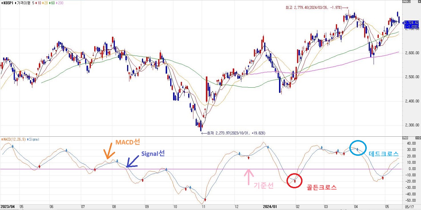 MACD(Moving Average Convergence-Divergence)란? MACD는 Moving Average Convergence-Divergence의 약자로 투자자가 주가의 추세를 식별하고 매수 또는 매도를 위한 시장 진입점을 정하는데 도움이 되는 기술적 지표입니다. MACD지표는 MACD선,